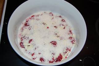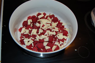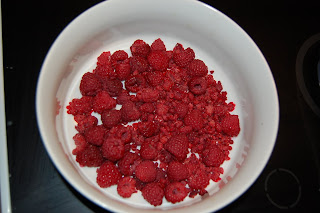1. Lägg upptinade hallon i en pajform.